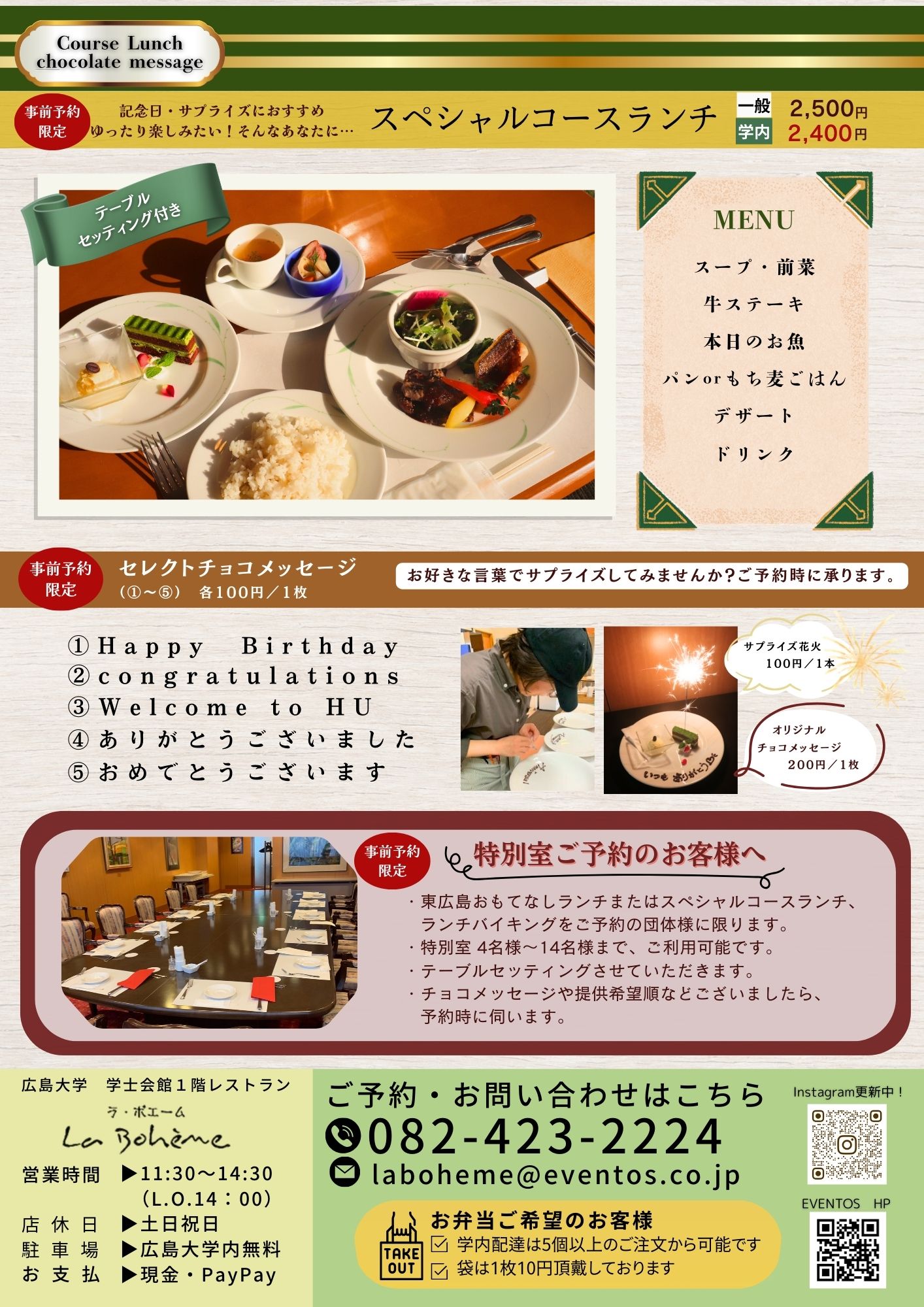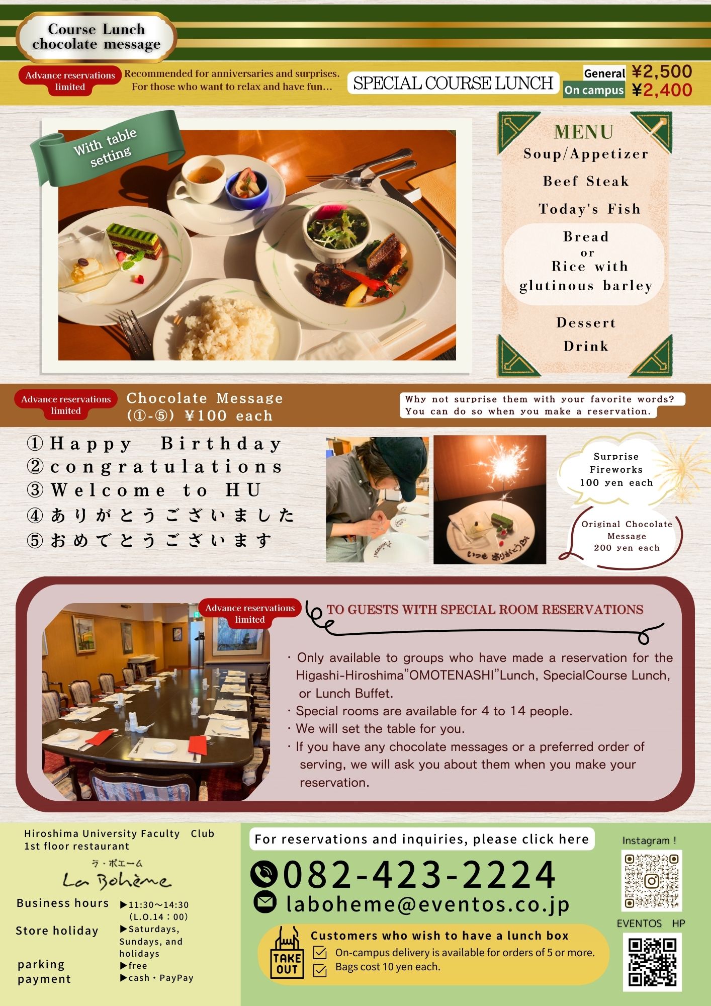 広島大学学士会館1階レストランLa Bohèmeではランチだけでなく、歓送迎会、懇親会等のご宴会のご予約を承ります。