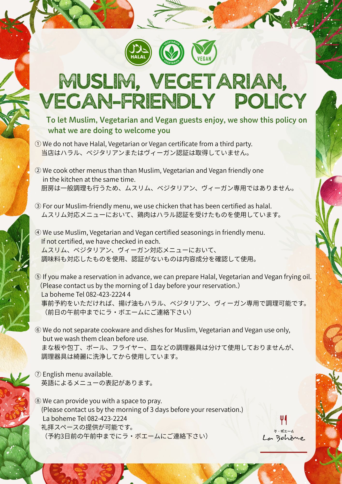 ムスリム・ベジタリアンポリシーと、英語メニューもございます。