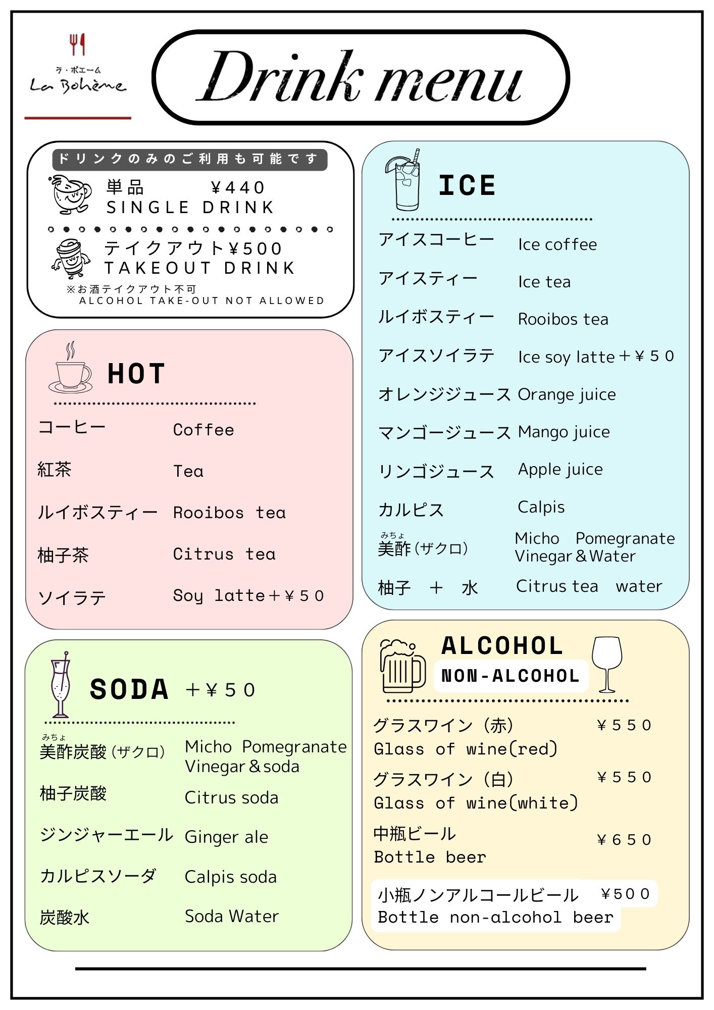 (上記プランは全て1,650円(税込)の 90分のアルコール付フリードリンク込み)